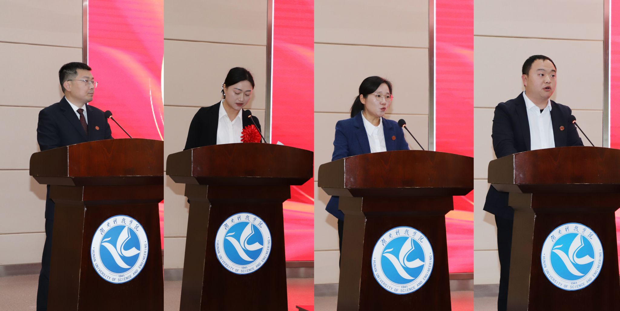 国家级一流本科专业建设点计算机科学与技术专业教师代表尹向东,国家级一流本科课程《大学英语》主讲教师胡维,湖南省教学创新大赛一等奖获奖教师廖春艳,全国大学生机械创新设计大赛一等奖指导教师罗哲先后发言。