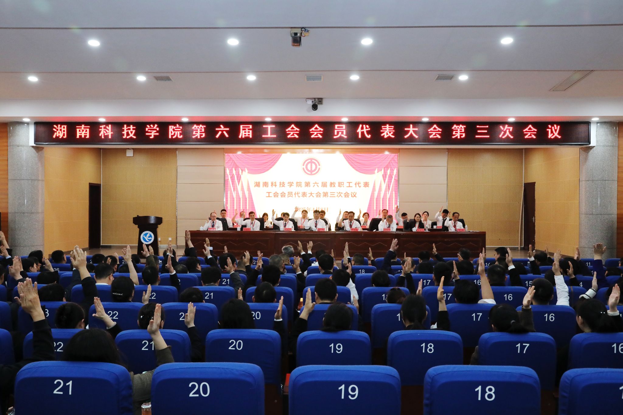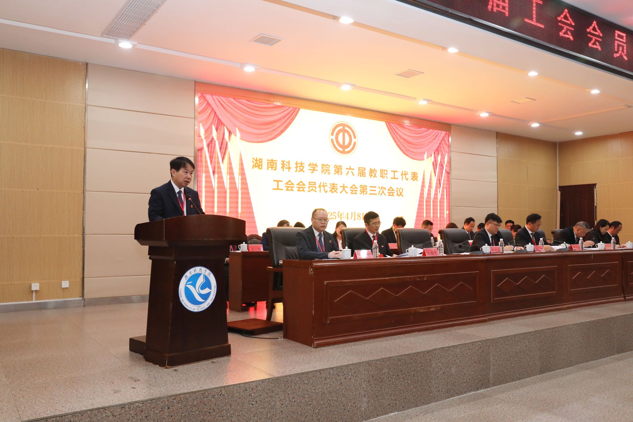 下午,为期一天的第六届教职工代表、工会会员代表大会第三次会议圆满完成各项议程,在潇湘大讲堂闭幕。会议通过学校工作报告、工会工作报告、2024年财务预算执行情况和2025年财务预算安排报告、工会经费审查工作报告。