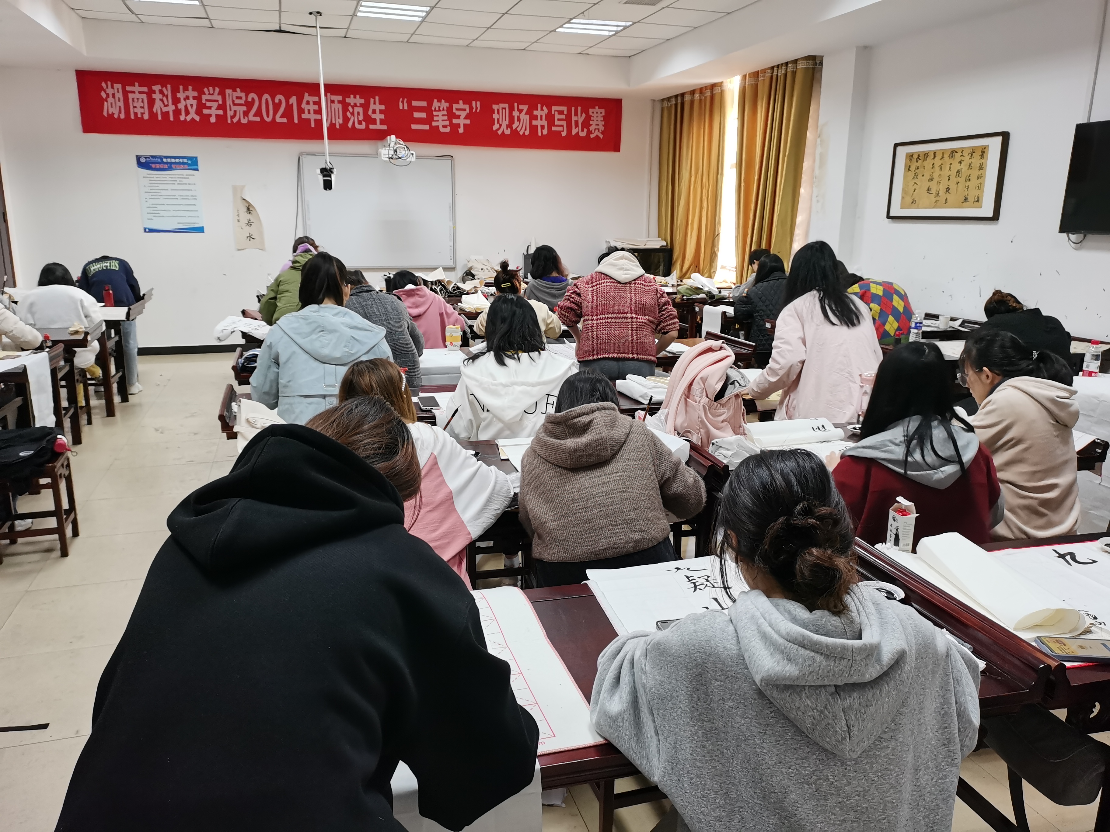 据悉,今年的参赛人数比去年增加了一倍,参赛学生所书写的钢笔字、毛笔字、粉笔字作品质量与往年相比均有较大幅度的提升。