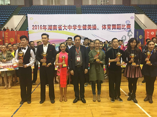 本网讯 10月26日至28日,由省教育厅主办的2016年湖南省大中学生健美操、体育舞蹈比赛在湖南师范大学举行,来自湖南省28所高校、7所中学的运动员汇聚一起同场竞技。我校25名运动员代表学校参赛,角逐学院组11个项目的奖牌。