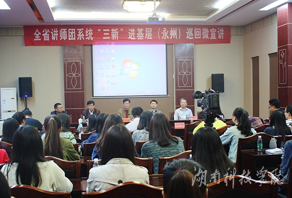 本网讯(通讯员 杜俊杰)10月21日上午,全省讲师团系统“三新”进基层巡回微宣讲永州专场在我校开讲。省委讲师团、市委讲师团、九州线上平台有关负责人参加宣讲会,我校外国语学院的50余名师生党员到场聆听。