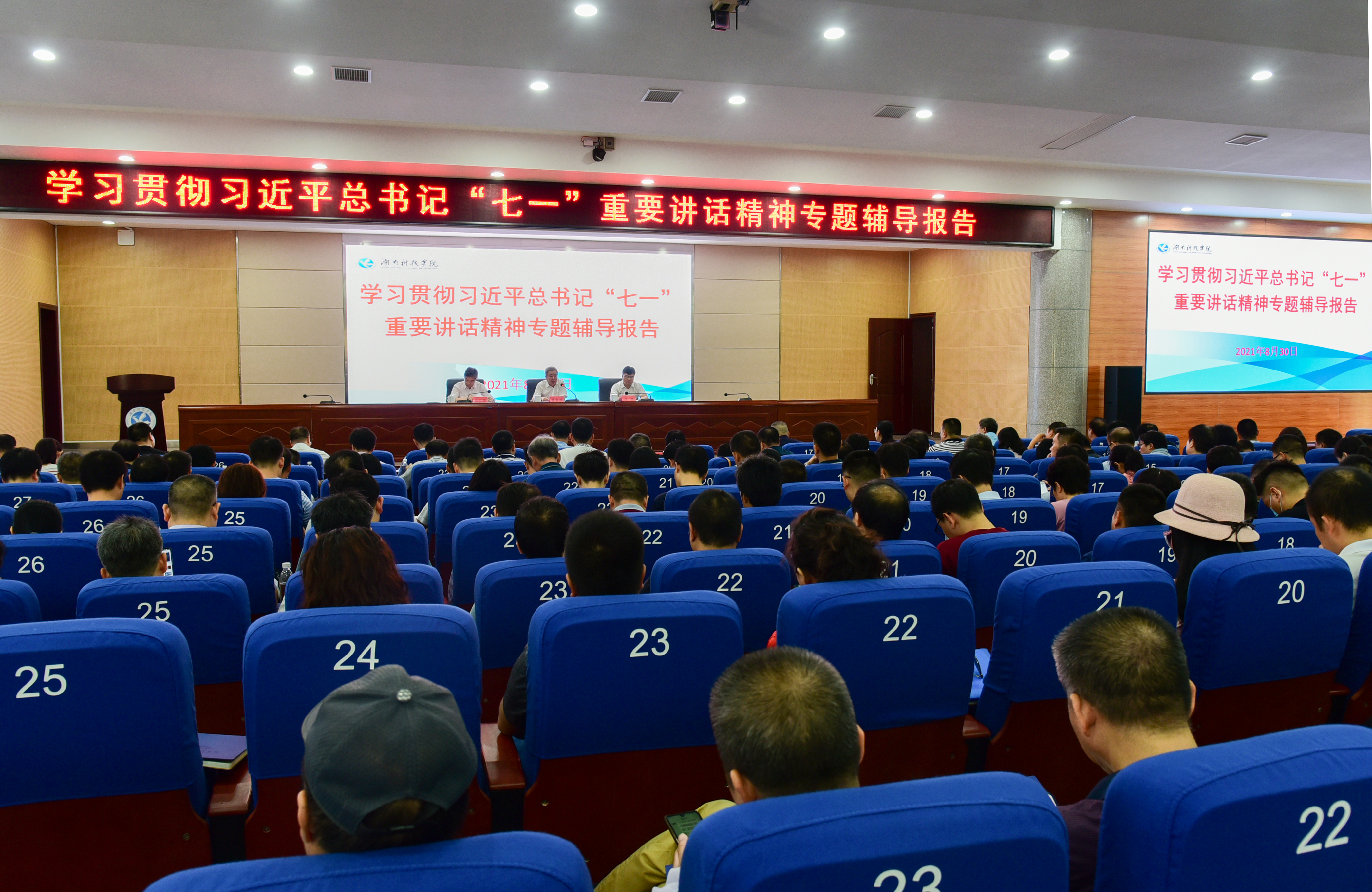 本网讯 8月30日上午,我校学习贯彻习近平总书记“七一”重要讲话精神专题辅导报告会在潇湘大讲堂举行,党委书记曾宝成作辅导报告,要求全体党员干部深刻领悟伟大建党精神,凝聚强大奋进力量,推动学校“十四五”发展开好局、起好步。