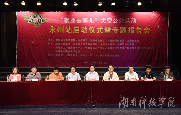 本网讯(记者 欧盼迪 裴滢 摄影何帅文)5月10日下午,湖南省2016年“就业去哪儿”大型公益活动永州站启动仪式暨专题报告会在我校举行,省内外52家企业为大学生提供就业岗位1200余个,进场求职学生1300余人,初步达成就业意向学生300余人。