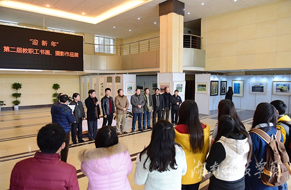 本网讯(实习记者 张云芳 赖文婷 摄影 何帅文)墨韵流淌处,处处都含婉转诗情,镜头旋转时,瞬息间倩影尽入心窗。12月25日,由我校教职工书画摄影协会主办的第二届“迎新年”教职工书画摄影作品展在行政办公楼一楼大厅开展。副校长宋宏福、李常健、程智开,工会主席、副校级督导陈仲庚,教职工书画摄影展协会会长欧小松等出席开展仪式。