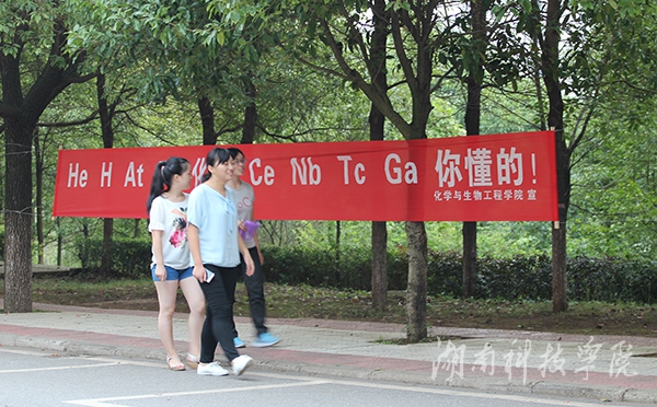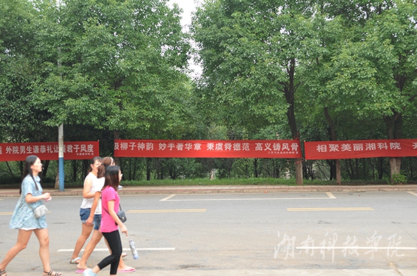 校园主干道高挂着红色迎新横幅,使迎新现场变得有声有色。