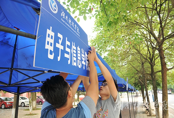在综合教学楼前,学生们正在搭建帐篷,安装学院名牌,方便学生咨询报到。