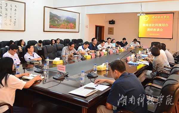 调研座谈时,我校文科基地负责人,学科带头人,研究所负责人,国家、省社科基金主持人等专家结合开展的研究工作实际,就加强和改进省社科基金项目管理、经费管理,进一步加强省社科研究基地建设,培育和打造“湘字号”社科研究工作等方面提出意见和建议。