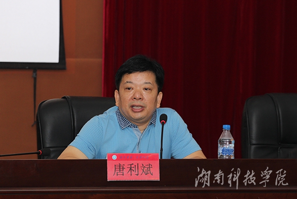 本网讯(记者 乐为 摄影 何帅文)8月26日上午,湖南省教育厅高等教育处处长唐利斌出席我校暑假干部培训班开班仪式并以“推进学校转型发展,提高人才培养质量”为主题作专题报告。报告由校党委书记陈弘主持。