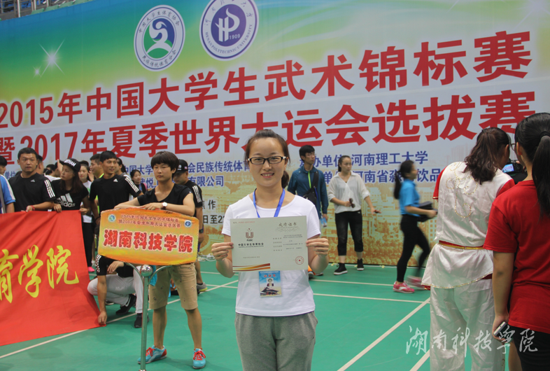 本网讯  7月17日至7月21日,由中国大学生体育协会主办的“2015年中国大学生武术锦标赛暨2017年夏季世界大学生运动会选拔赛”在河南理工大学举行。体育学院学生江珂获女子“龙身蛇形”太极拳铜牌,并被确定为“2017年世界大学生运动会”候选队员,这是我校在全国体育竞赛中奖牌“零”的突破,也是湖南省高校历史上参加全国武术竞赛的第三次夺牌。
