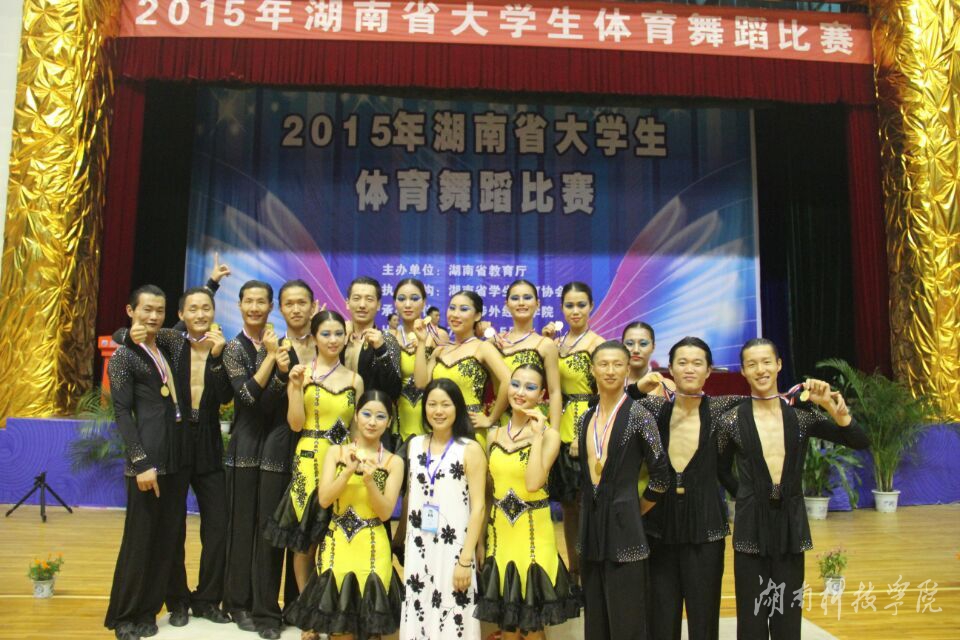 本网讯(通讯员 龚纯波)2015年湖南省大学生体育舞蹈比赛于7月4日-5日在湖南涉外经济学院体育馆隆重举行。我校代表队在体育学院党总支书记何智强、主教练肖志艳老师带领下,共斩获5枚金牌、1枚银牌与4枚铜牌。