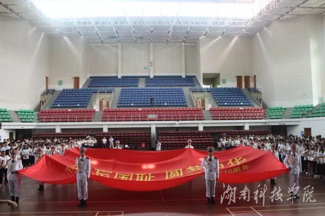 国旗班护送活动主题旗帜——爱国旗入场,爱国旗面积70平米,寓意抗战胜利70周年。在旗帜的正面印刻着此次活动主题:勿忘国耻,圆梦中华。我校12个教学学院师生代表依次在上面签名,旗帜上密密麻麻的师生签名无不体现着他们不忘历史,缅怀先烈,热爱和平,开创未来的决心。