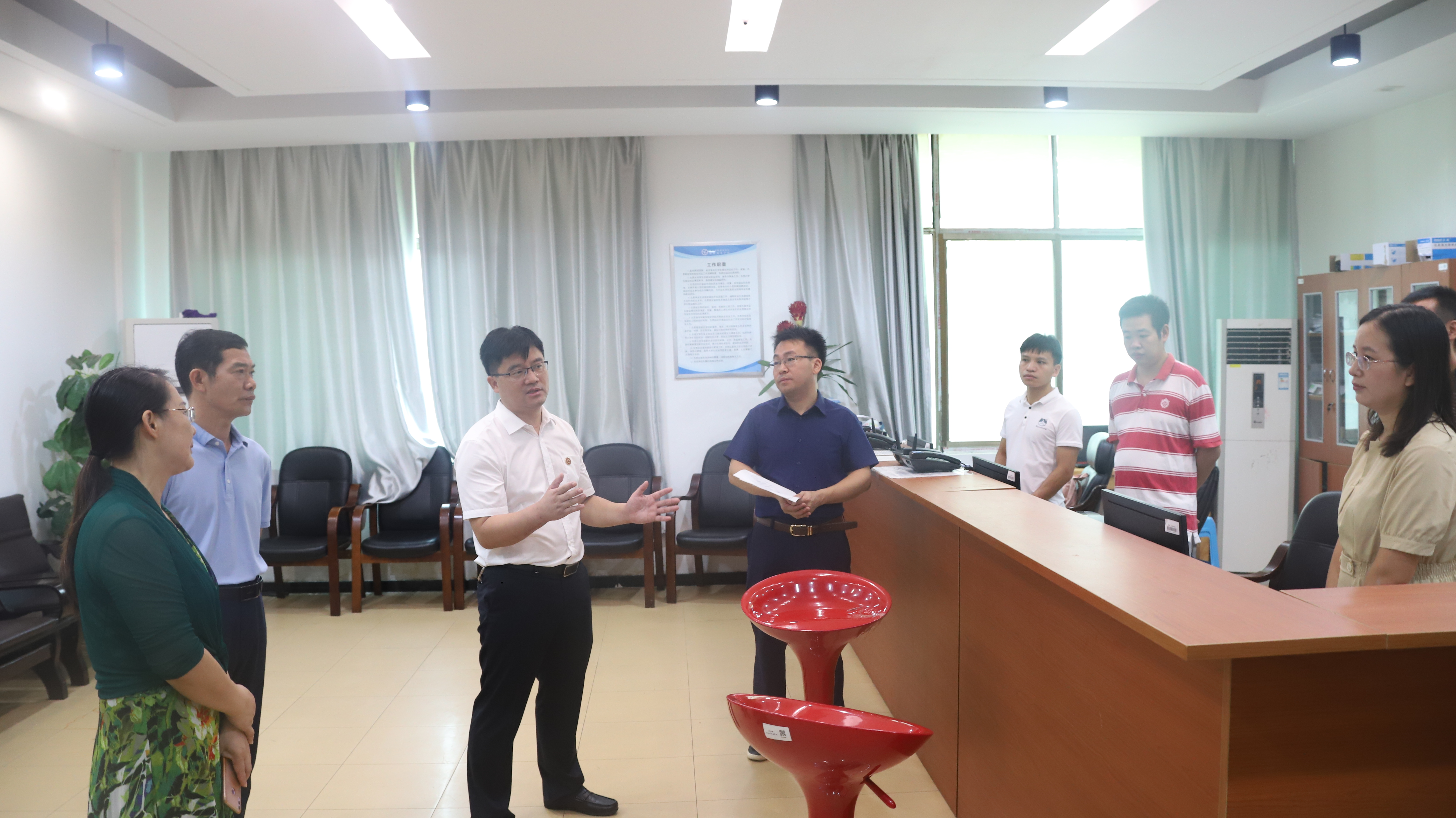 在招生就业处,校领导亲切慰问招生就业工作人员,详细询问了招生录取情况和就业进展情况。李钢对今年的招生工作取得的成绩表示充分肯定,要求要继续加强宣传力度,指导各教学学院加强对新生的人文个性化关怀,让新生充分感受到湘科院大家庭的温暖。针对今年的就业工作,李钢表示,今年就业工作任务艰巨,希望招生就业处精准施策,坚持结果导向,转变工作思路,讲究方式方法,落实责任,提升就业率。