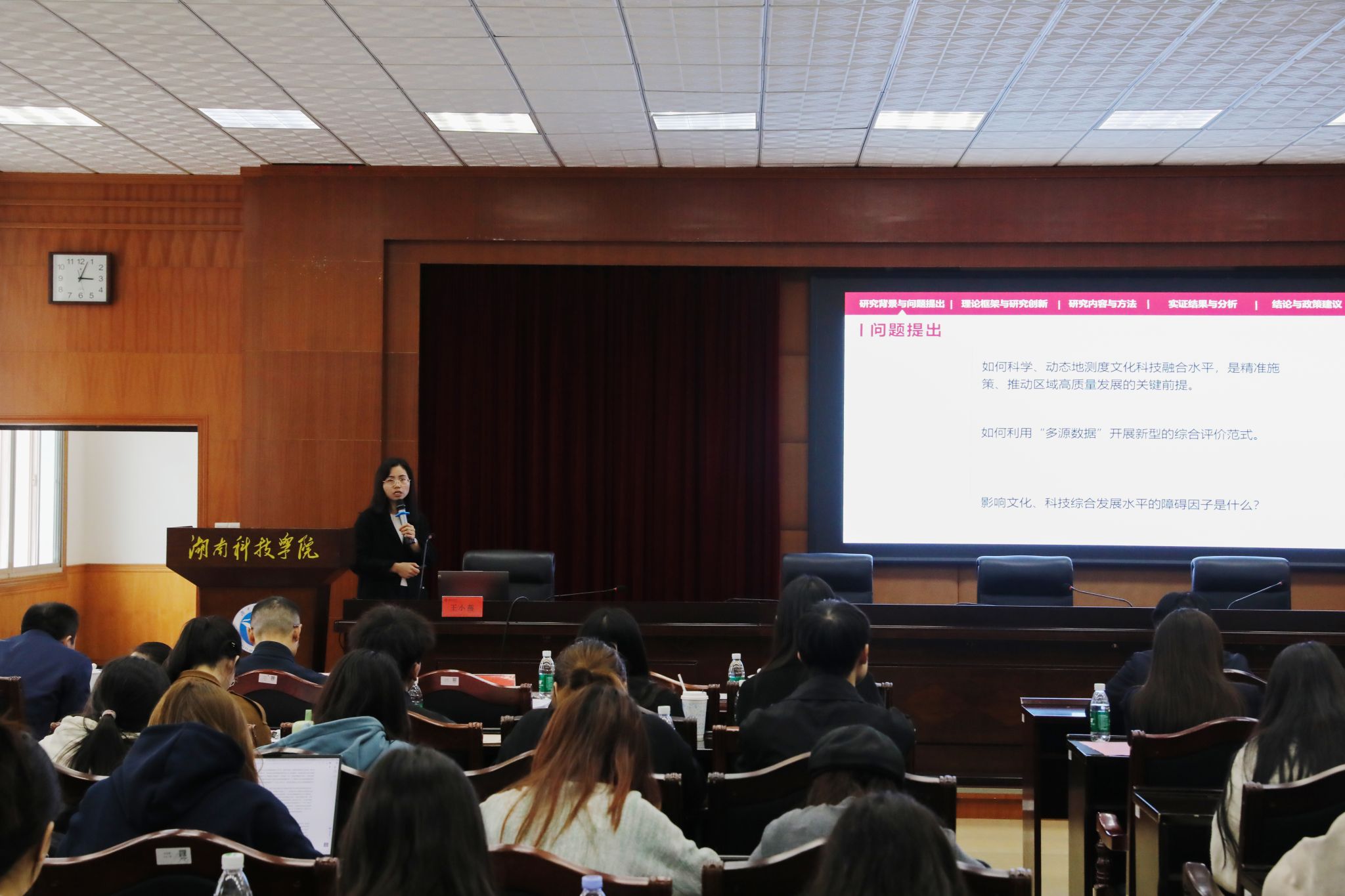 在交流发言环节,湖南农业大学经济学院郑毅以《科技赋能传统文化与旅游融合的机制构建与路径选择——以永州为例》为题,中南林业科技大学涉外学院禹文婷以《湖南省文化-旅游-数字产业发展态势与耦合协调研究》为题,湖南省社科联机关党委(人事部)杜宏丹以《AIGC的赋能与颠覆:文化产业内容生产的范式重构》为题,湘潭大学商学院闫宇晨以《制度型开放对城市创业的影响研究:来自跨境电商综合试验区的经验证据》为题,湘潭大学商学院周海欣以《数字普惠金融对制造业韧性的空间溢出效应研究——产业协同集聚的调节作用》为题,中南林业科技大学经济管理学院孙颖以《长江经济带文化与科技“两业融合”的产业升级效应研究》为题,湖南都市职业学院李茜以《音视频产业赋能湖南文化资源数字化发展研究》为题,湘潭大学法学学部扶紫媛以《民事诉讼中表情符号作为证据适用的现实困境与规范路径》为题,九州线上平台蔡保忠以《数字文旅促进城乡共同富裕:作用机理与效应分析——基于中国县域面板数据的实证研究》为题,分享了文化和科技融合发展的研究心得与实践感悟。