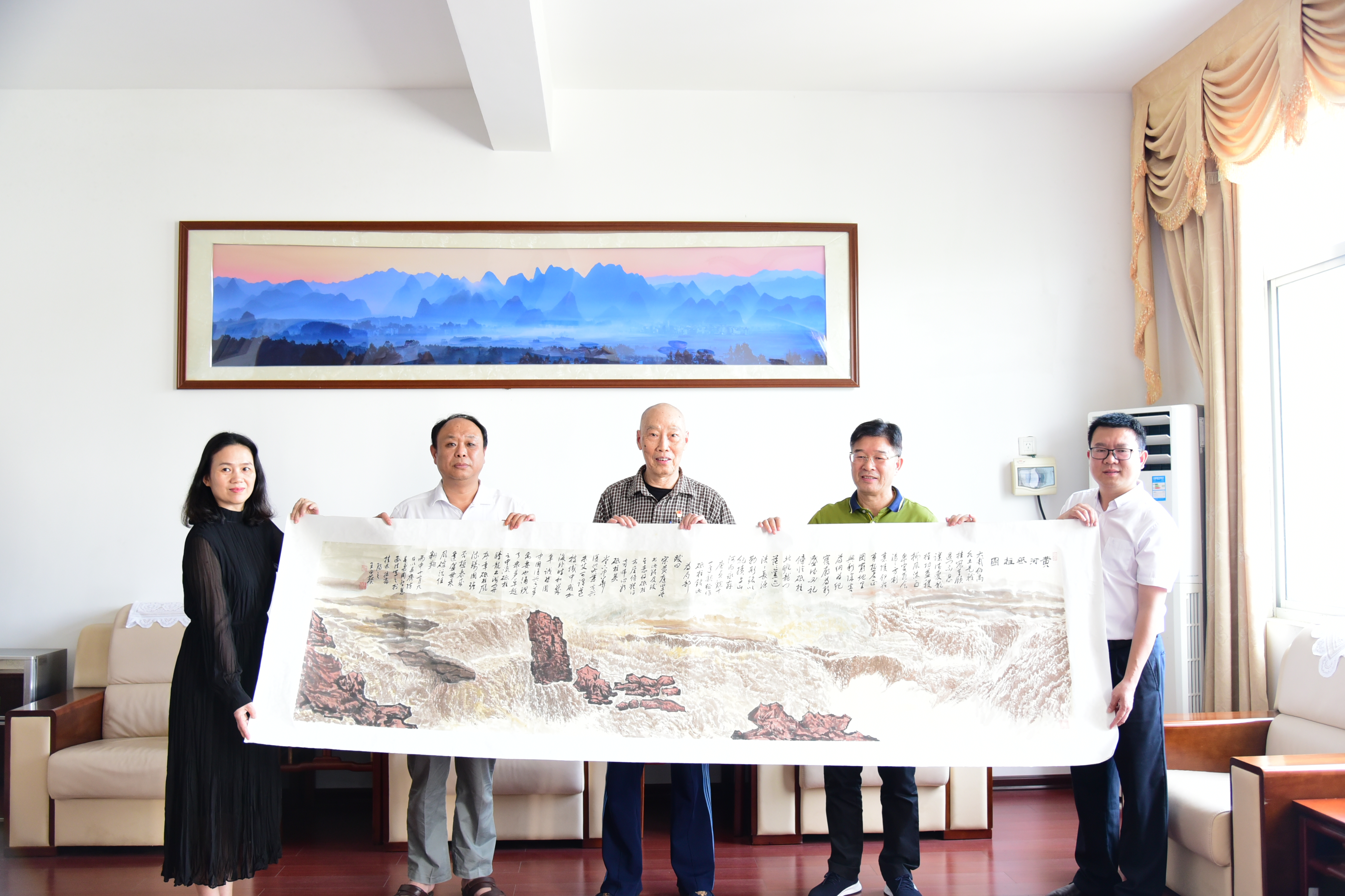 本网讯(记者 袁嘉 黄宇莹)为庆祝建党100周年,6月7日下午,我校退休教授王田葵亲手将其精心构思历时半年创作的《黄河砥柱图》画作捐赠给永州市委。画作将由永州市博物馆收藏。党委副书记宋宏福出席捐赠仪式并进行座谈。永州市文化旅游广电体育局党组成员、副局长张科春接收王田葵教授捐赠的作品,并向其颁发收藏证书。