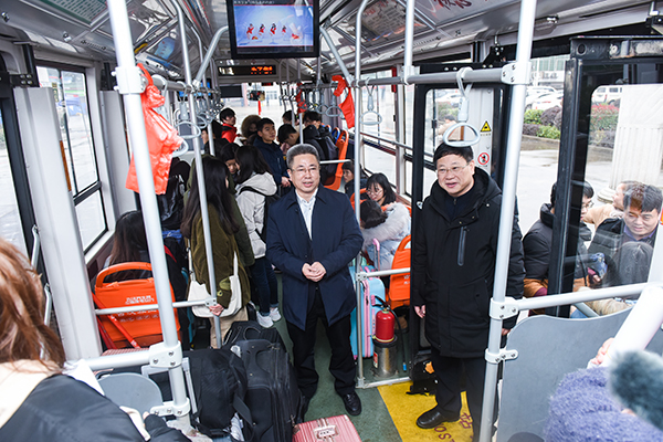 本网讯 “回家的路上一定要注意安全,途中不要逗留,及时回家,不要让爸爸妈妈担心。”1月15日,党委书记、校长曾宝成来到学生离校免费乘车点看望离校学生,叮嘱他们注意安全,并祝福同学们过一个欢快的春节。