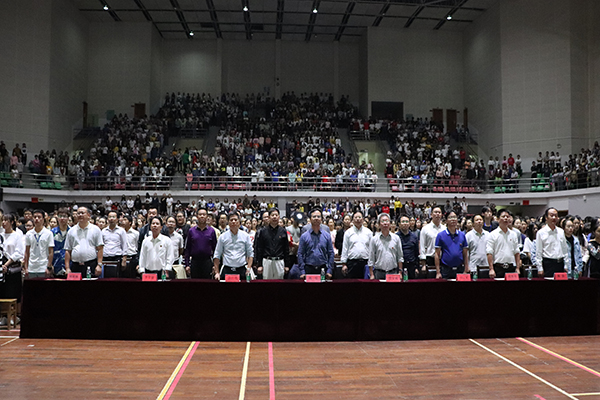 本网讯  9月29日晚,学校举行庆祝建国69周年暨“筑梦新时代”2018年迎新文艺晚会。党委书记陈弘、校长曾宝成及校领导唐艳明、彭立威、李常健、程智开,党委委员、组织部长何福林,党委委员、宣传统战部长杨涛等与4000余名新生欢聚一堂,共同观看晚会,共庆祖国69周年华诞。