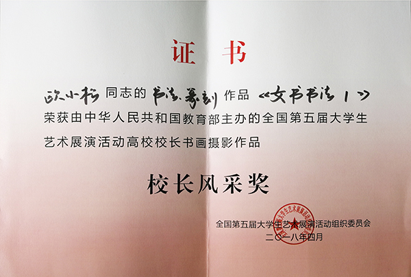 本网讯 日前,由教育部主办的全国第五届大学生艺术展演活动闭幕。欧小松教授的书法篆刻作品《女书书法》荣获全国高校校长书画摄影作品“校长风采奖”,并被《中华儿女美术馆》收藏。