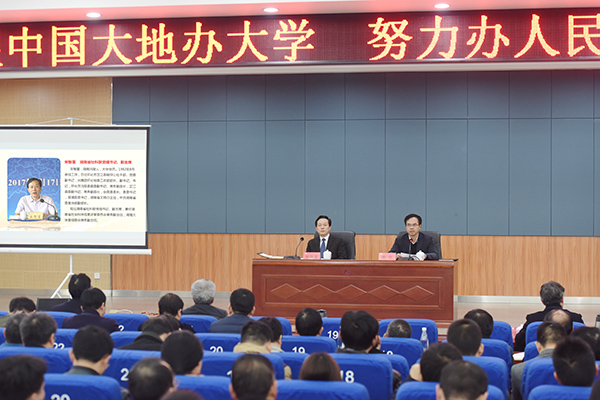 本网讯 12月6日下午,湖南省社科联党组书记、副主席宋智富以“深入学习贯彻党的十九大精神 奋力建设富饶美丽幸福新湖南”为主题,来校宣讲十九大精神。宣讲会由党委书记陈弘主持。党委副书记、校长曾宝成及在校领导宋宏福、彭立威、郑山明、李常健、吴小林、程智开,永州市社科联主席陈水恩等参加了这次宣讲会。
