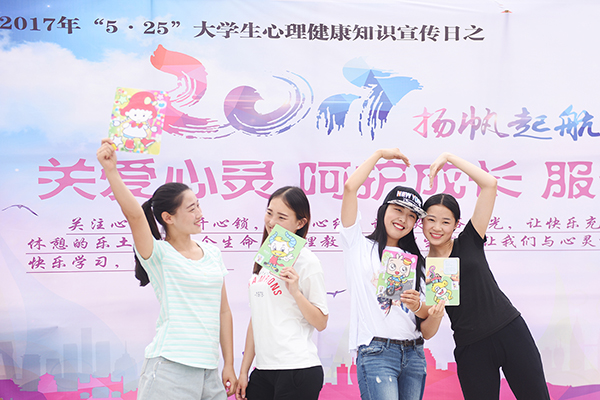 本网讯 5月25日,由学工部、武装部、团委主办,大学生心理健康教育中心及各教学学院承办的2017年“5·25”大学生心理健康知识宣传日之“关爱心灵,呵护成长,服务成才”在文化广场举行。校党委书记陈弘、副校长吴小林饶有兴致地参与此次活动。