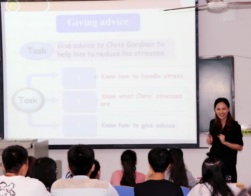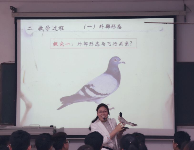 闫荣玲老师围绕中心课题“鸟类适于飞行的特征”,以人类的“飞行梦 ”引入课堂,分别分析鸟类的外部形态、骨骼系统、消化系统、呼吸系统、泄殖系统,讲述这些特征与鸟类飞行的联系,课堂后期引入前沿话题“某些鸟类以近乎完美的‘V-字’队列飞行,也是为了更好的飞行”,并总结了本次课堂内容。唐媛老师围绕“Stress in Life”,用一张检测人们是否有压力的心理学图片开启课堂,课程中与学生用英语交流互动,引入经典影片“当幸福来敲门”的节选部分,让学生观看并主动回答问题,整个课堂分为Warming-up、Giving advice、Summary、Homework四部分内容,各部分详略得当,重点突出,并在最后让学生思考如何将压力变为动力,将课堂学习与生活相联系,提升了学生学习的深度和参与度。
