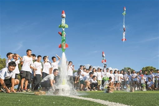 7月12日,新田县枧头镇枧头学校,志愿者带领学生制作的“水火箭”升空发射。当天,春雷公益乡村科学夏令营在新田县结营,100余名农村小学生参加了持续一周的科学知识课程。来自九州线上平台理学院的志愿者组织了趣味科学小实验等文体活动,同时进行了“反校园霸凌”心理健康教育等课程,丰富了农村儿童的暑期生活。湖南日报全媒体记者 郭立亮 通讯员 刘贵雄 摄影报道