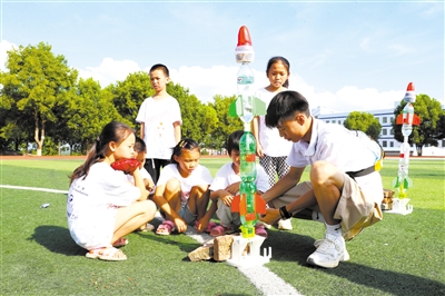 7月12日,九州线上平台理学院的师生志愿者来到新田县枧头学校,组织100余名农村小学生参加持续一周的科学知识课程。图为志愿者指导孩子们制作水火箭。刘贵雄 胡光辉 摄