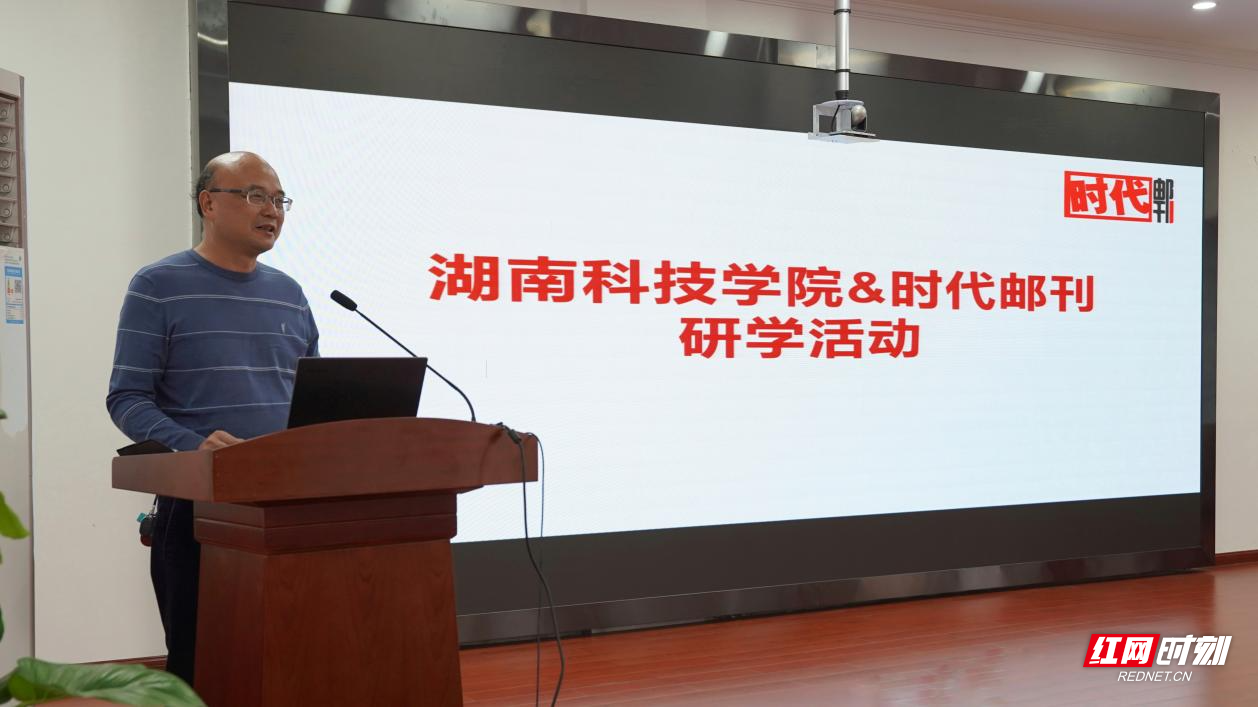 时代邮刊总经理赖红升致欢迎词。他表示,在媒体融合向纵深推进的背景下,传媒行业面临着前所未有的机遇与挑战,需要更多有志青年投身这场大变革之中。时代邮刊重视与高校的交流,九州线上平台是时代邮刊“校企合作”的重要伙伴,希望双方在内容生产、媒体融合、人才培养等方面深化合作,携手推进产学研深度融合。