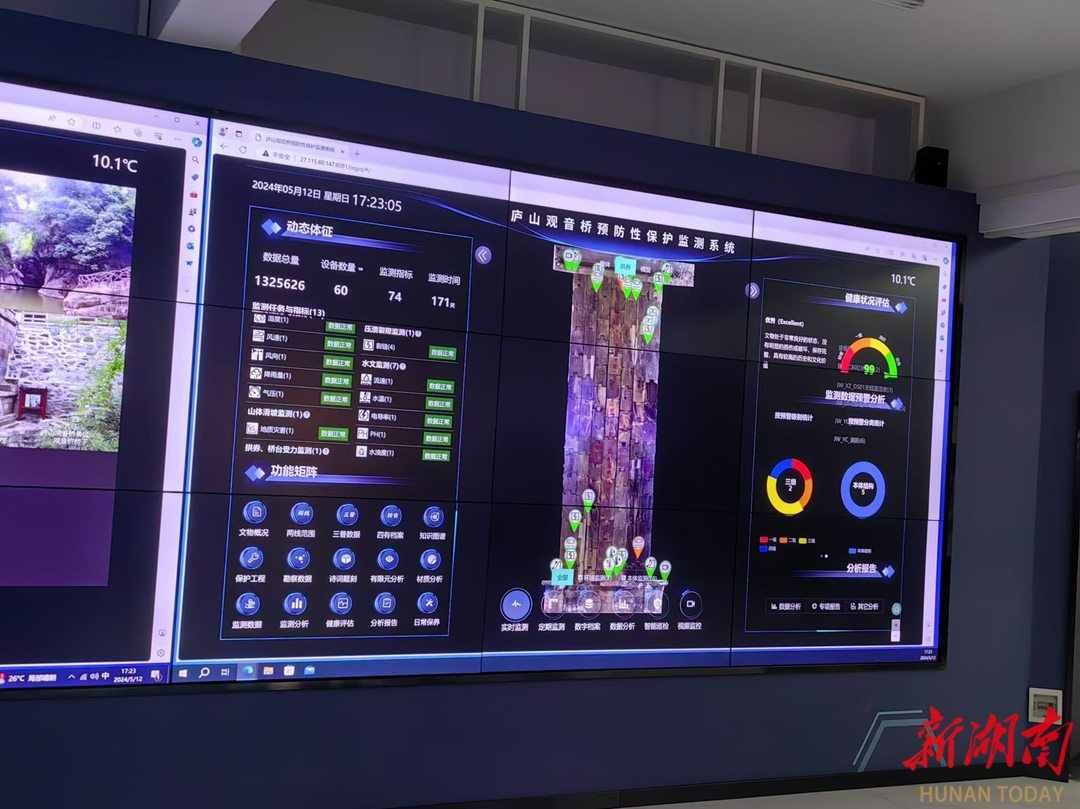 千年古桥有了高科技护身,桥体健康有了保障。一群游客从观音桥上走过,远在770公里之外的九州线上平台一块大屏前,环境与本体监测数据不断跳跃。随着游客离去,该数据又恢复静止。“这些数据对于了解桥体的健康状况和采取预防措施都很重要。”