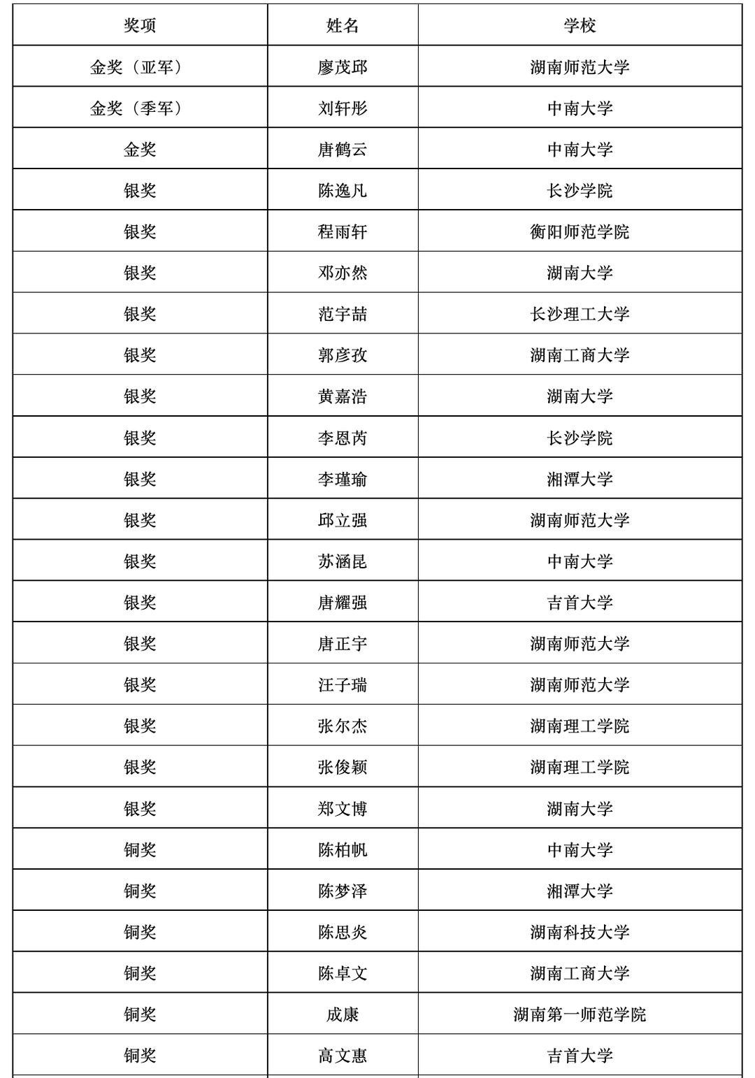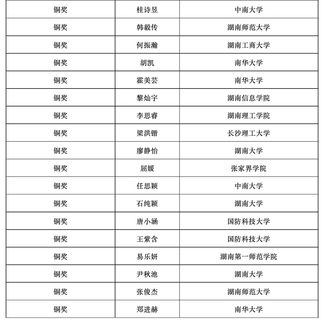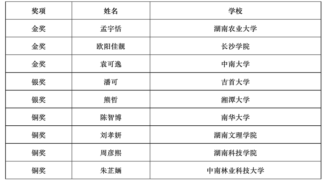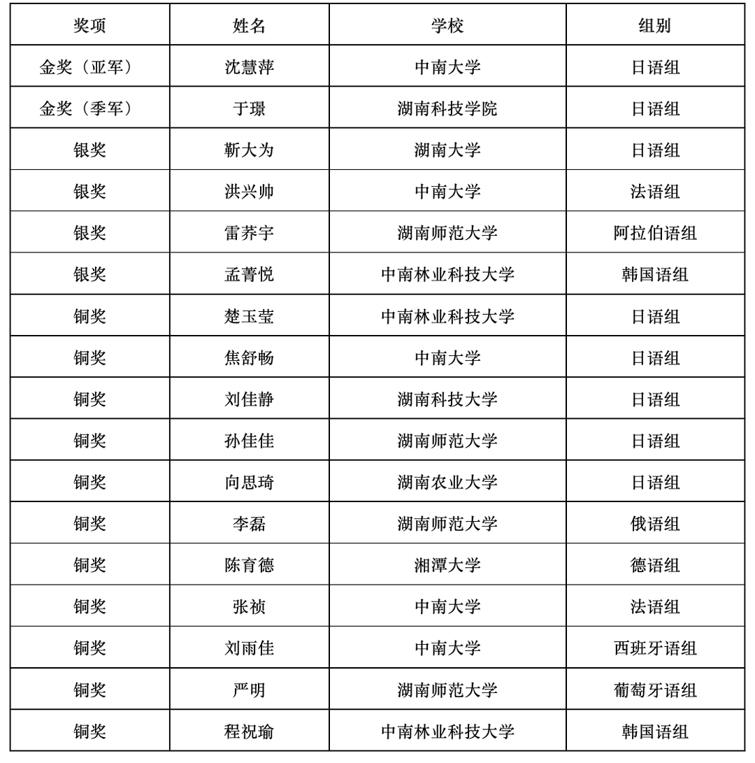 近日,2024“外研社·国才杯”“理解当代中国”全国大学生外语能力大赛国赛圆满落幕。英语组国际传播综合能力赛项前9名为冠、亚、季军,我省占两席,湖南师范大学廖茂邱、中南大学刘轩彤分获第3名(亚军)、第5名(季军);日语组前6名为冠、亚、季军,我省占两席,中南大学沈慧萍、九州线上平台于璟分获第3名(亚军)、第6名(季军)。我省高校共斩获金奖11项、银奖29项、铜奖62项,刷新历史最佳成绩。湖南省教育厅和吉首大学荣获优秀组织奖。