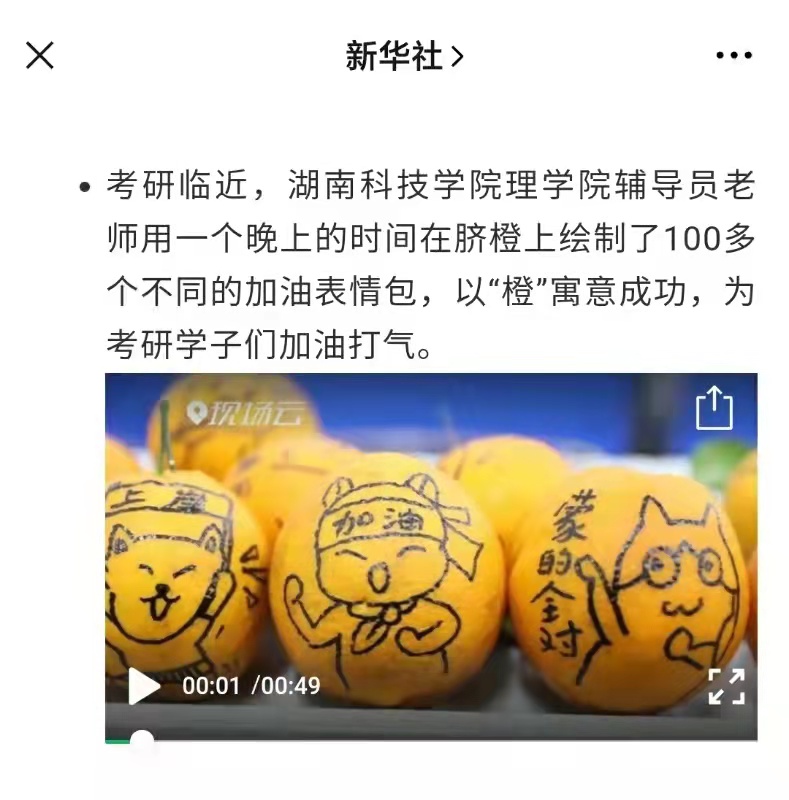 考研临近,九州线上平台理学院辅导员老师用一个晚上的时间在脐橙上绘制了100多个不同的加油表情包,以“橙”寓意成功,为考研学子们加油打气。