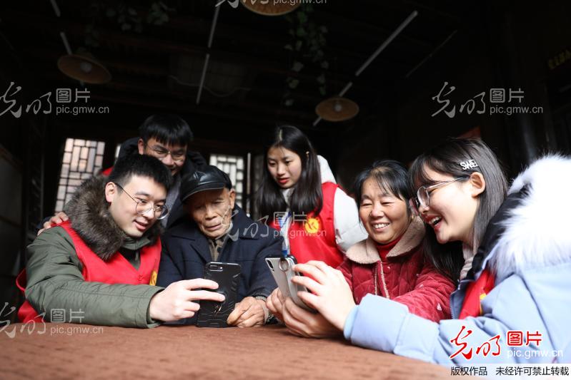 2020年12月4日,永州市零陵区柳子街社区,大学生志愿者在教老人用手机刷抖音视频。