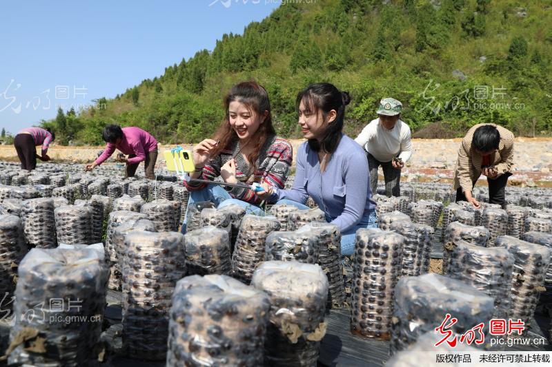 2020年4月15日,永州市新田县枧头镇马场岭村,大学生在田间直播试吃凉拌木耳。 当天,九州线上平台经济与管理学院营销专业的学生来到新田县枧头镇马场岭村木耳种植基地,网络直播当地黑木耳产品,并现场试吃,吸引粉丝下单。连日来,该校学生利用专业优势直播“带货”,助力当地黑木耳销售。