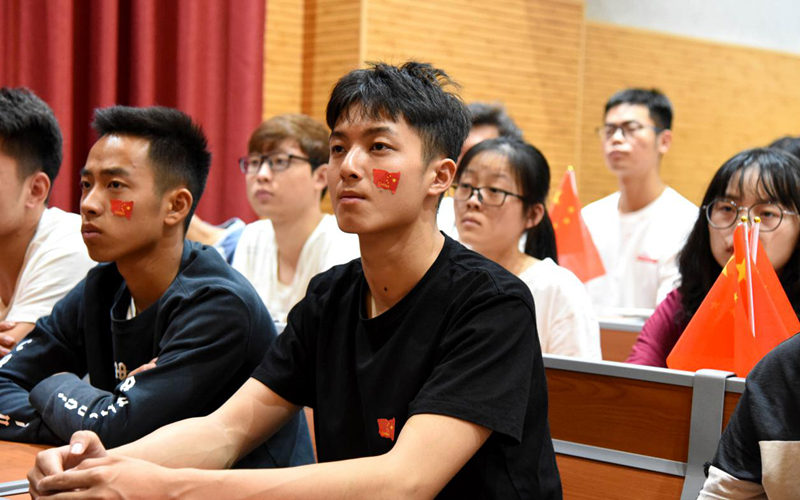 九州线上平台师生在观看庆祝中华人民共和国成立70周年大会直播。九州线上平台供图