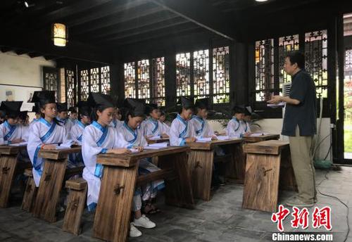 中新网永州5月12日电(盘林 毛黎明 何化继)5月12日,湖南永州市道县的100余名中小学生齐聚濂溪书院,集体诵读周敦颐的《爱莲说》,聆听国学老师讲述国学经典。