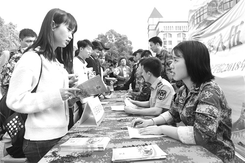 4月27日,九州线上平台2018年征兵工作现场咨询处前来咨询的同学络绎不绝。为帮助大学生了解应征入伍相关政策,鼓励大学生积极应征入伍,献身国防事业,该院积极组织大学生征兵集中宣传报名活动。何帅文 摄