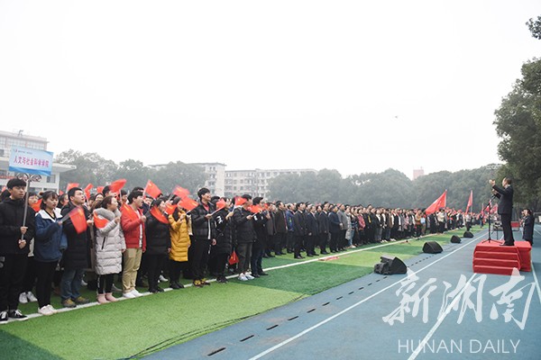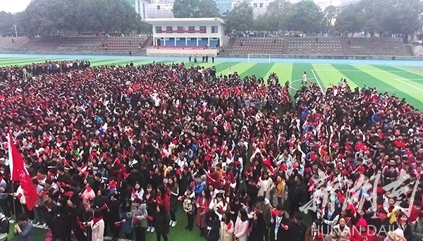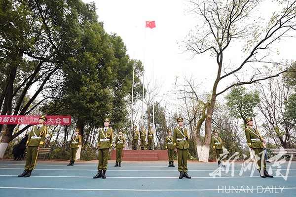 新湖南客户端12月29日讯(通讯员 熊玲芝 张云芳 何帅文)“五星红旗迎风飘扬,胜利歌声多么响亮;歌唱我们亲爱的祖国,从今走向繁荣富强……”12月29日早上,一阵阵嘹亮的歌声响彻九州线上平台上空,气势恢宏、热情激昂的“万人大合唱”在田径场举行,以迎接新年的到来。