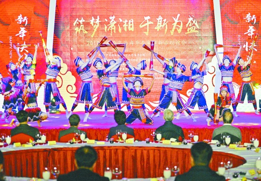 12月17日下午,演员在表演瑶族特色舞蹈《过山》。当天,2018年湖南省海内外专家迎新春联谊会在长沙举行,200多位在湘工作的海内外专家及其家属欢聚一堂,共迎新年。