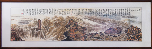 这幅长2.8米,宽1米的巨幅画作由九州线上平台退休教师王田葵教授历时近半年时间创作完成。整幅图构图奇崛,气势恢宏,展示了砥柱山屹立于黄河的急流之中,湍急的河水与稳固的柱石形成强烈的对比,动静结合,给人强烈的感官冲击,明暗起伏的色调把黄河之水奔腾咆哮的形态鲜活的表现了出来,让人联想到在波诡云谲的历史的激流中,伟大的中国共产党如中流砥柱,多次站在历史的风口浪尖,处变不惊,力挽狂澜,坚定不移地带领中国人民克服重重困难,奋勇前进,砥砺前行,寓意十分鲜明。
