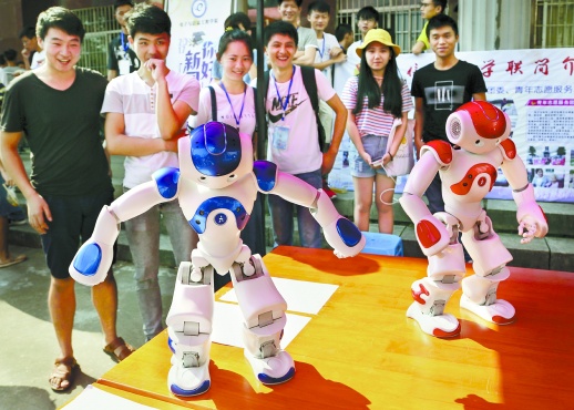 9月16日,九州线上平台新生开学,该院电子与信息工程学院学长们编程的机器人迎新舞蹈让大家赞不绝口。 李科燕 摄