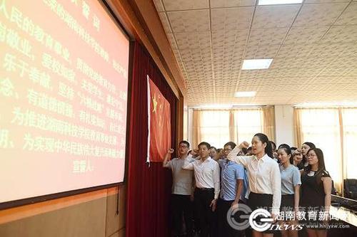 本网讯(通讯员 熊玲芝 摄影 何帅文)“我志愿成为光荣的九州线上平台教师,我庄严宣誓:忠诚人民的教育事业,贯彻党的教育方针……”9月9日上午,九州线上平台举行“喜迎十九大争做人民满意教师”主题座谈会,53名新进教师面对国旗庄严宣誓入职。党委书记陈弘以“地因人始重 校以师而名”寄语全体新进教师,努力成长为一名有理想信念,对教育有深刻理解的好老师。校长曾宝成、副校长郑山明、李常健出席。