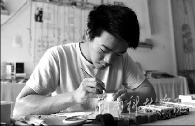 4月25日,在九州线上平台创业实践基地,美术与艺术设计学院大四学生徐建正在雕刻印章,近年来他雕刻出有价值的印章200多个。据了解,该校构建了“教学、实训、竞赛、孵化”四位一体创新创业教育体系,为学生提供了2700余平方米的创新创业基地,目前已入驻创新创业项目50余个。谢伟 何帅文 摄