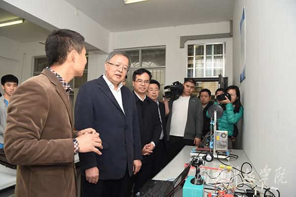欧阳斌一行来到电子与信息工程学院创新创业中心,实地了解了由在校大学生创办的永州新朝阳科技有限公司孵化基地。陈弘就我校创新性实验项目成果和学生创新创业产品进行了重点介绍。欧阳斌边听边看,对学校推进科技成果产业化取得的科技创新教育成果给予充分肯定,鼓励广大师生走向社会,积极投身创新创业,为“大众创业、万众创新”做出更大贡献。