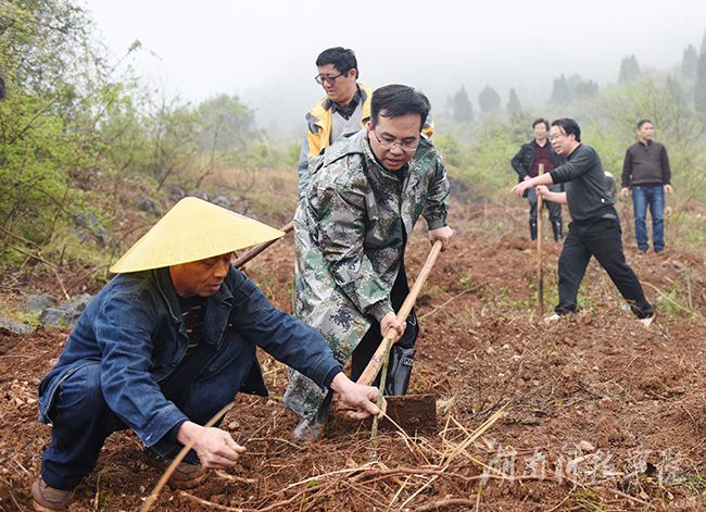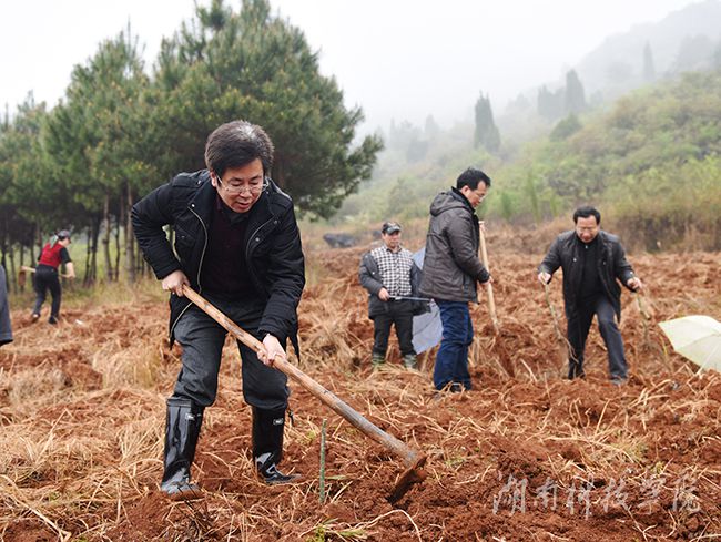 新华网永州3月18日电 3月16日,新田县龙泉镇潮水铺村细雨蒙蒙,九州线上平台校党委书记陈弘、校长曾宝成等校领导和40余名中层干部来到该村开山种树,发展金槐产业,为缺乏劳动力的贫困户种植金槐500余株,为当地金槐产业再添一片新绿。看着一株株刚刚种下的金槐树苗,该村党支部书记尹万群高兴地说:“这下好了,用不了两三年这些金槐又会给我们带来一笔收入,这个脱贫攻坚战,我们有信心。”