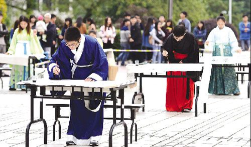 挥毫遒劲书正气, 翰墨飘香展清廉。11月22日,九州线上平台举办“学廉、倡廉、爱廉”书法大赛 ,此次大赛,将书法艺术和廉洁文化融合在一起,丰富了师生文化生活,推动学校廉政文化建设,弘扬风清气正的校园风气。 图为该院学生身着汉服在书写书法。匡皓 何帅文 摄。