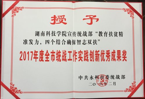 2月27日,中共永州市委将纪委、党办、组织、宣传、统战、政法等党务部门的工作会议合并召开。市委书记、市人大常委会主任李晖出席并讲话,市委副书记、市长赵应云主持会议,市委副书记、市委政法委书记唐湘林宣读表彰通报。我校荣获2017年度全市统战工作先进单位称号,全市统战工作首次纳入市委考核,我校首次获此殊荣。下午,全市统战部长会议在南华大酒店召开。我校宣传统战部“教育扶贫进准发力,四个结合确保智志双扶”获2017年度全市统战工作实践创新优秀成果奖。