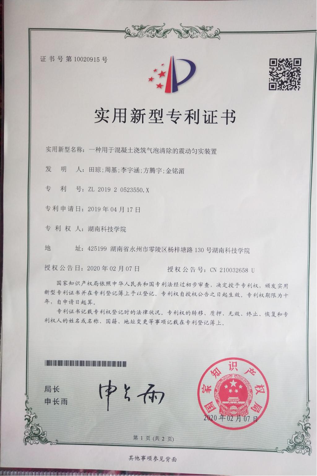 李仁平专利ZL 202020122253.7一种透水抗裂型运动场地-实用新型专利证书(签章)