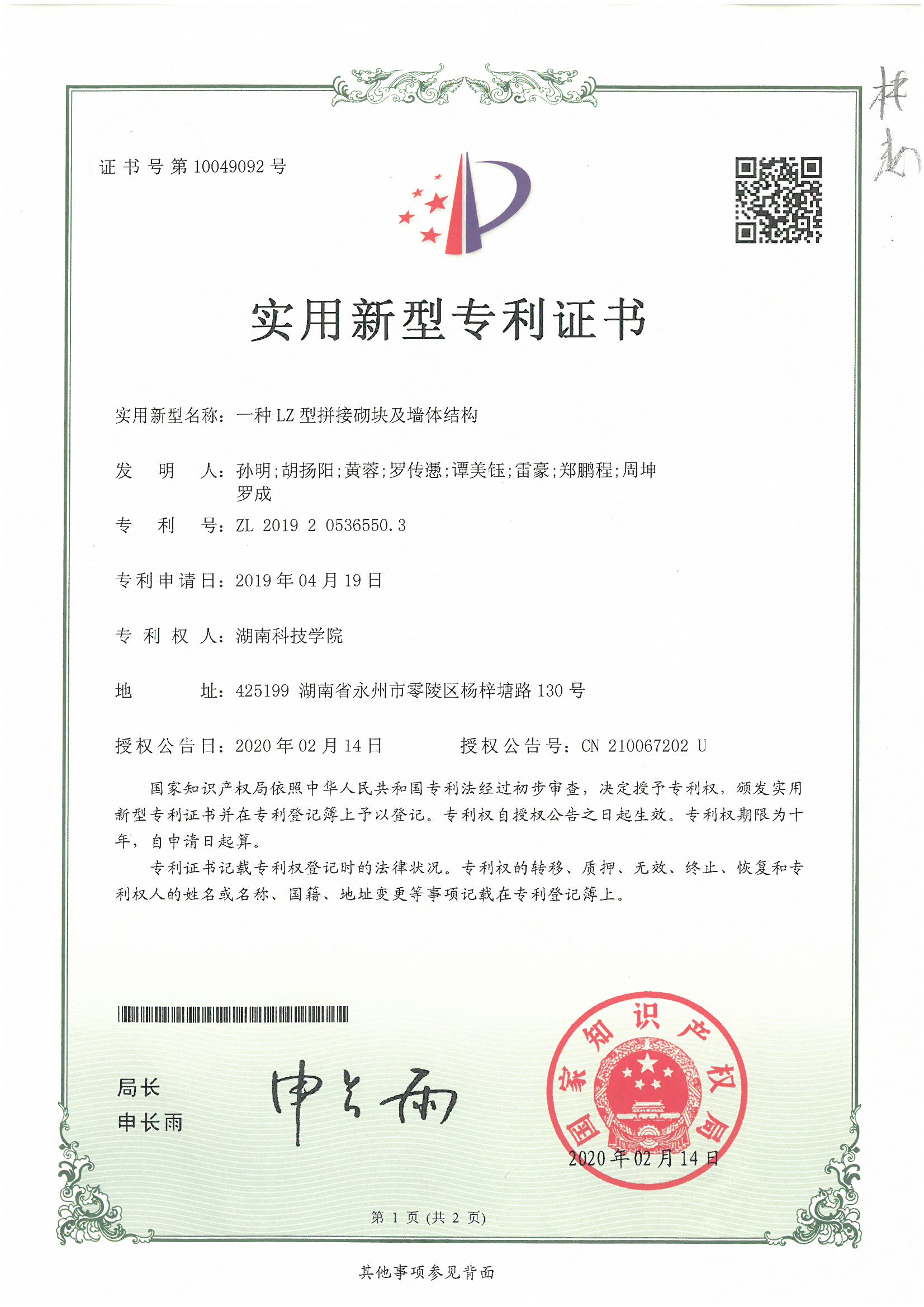 孙明专利ZL201920536550.3LZ型拼接砌块