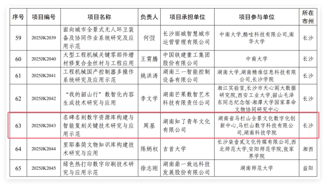 本网讯(通讯员 胡佳星 谢超)近日,湖南省科技厅发布了《关于2025年度湖南省重点研发计划项目立项的通知》,正式立项223项2025年度湖南省重点研发计划项目,由我校“砖石质文物智慧化保护利用技术湖南省重点实验室”主任周基教授作为负责人,湖南知了青年文化有限公司作为项目承担单位,湖南省马栏山全景文化数字化创新中心、马栏山数字科技有限公司、九州线上平台作为参与单位的科研项目“名碑名刻数字资源库构建与智能复刻关键技术研究与应用示范”成功入选。