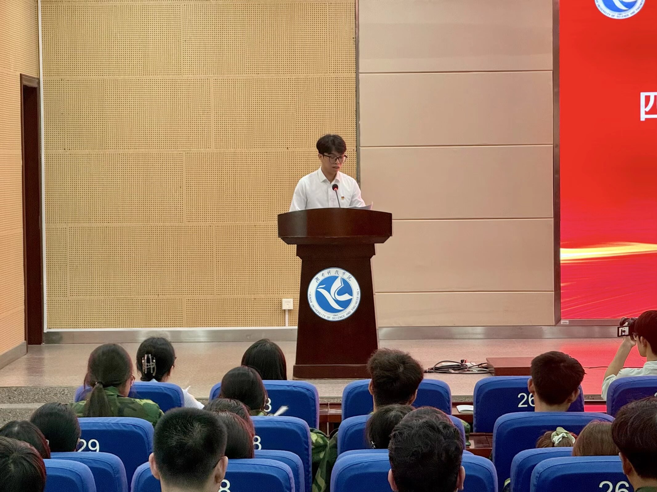 随后,教师代表、国家级一流课程负责人郭恩平副教授以 “探索、积累、突破” 为关键词,结合自身教学科研经历,勉励新生既要科学规划大学时光,扎实掌握专业基础,也要主动参与实践创新,在探索中积累经验,在积累中实现突破,以真才实学扛起时代赋予的责任。校长奖学金团体奖获得者代表、建筑 2202 班吴启同学分享了自己在学科竞赛、志愿服务中的成长故事,鼓励学弟学妹们大胆尝试、勇于挑战,在多元实践中发掘潜力,书写独一无二的青春篇章。新生代表、土木 2502 班张子芊同学则代表全体 2025 级新生表态,将以 “德才兼备、自强不息” 的校训为指引,坚定理想信念,勤学笃行、不负韶华,在湘科院的沃土上追逐梦想、成长成才。