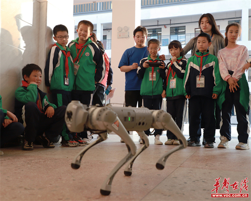 “它会动吗?”“它当然会动啦,它可是机械狗。”课后,孩子们的目光聚集在这两个“不明生物”上,趴下、起立、跳舞,志愿者摆弄着机械狗做出一个个让孩子们惊叹的动作。